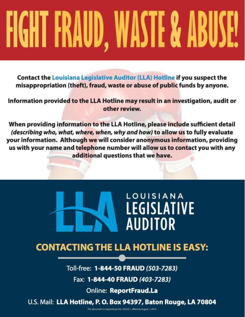 In accordance with Louisiana law, Helix Community Schools provides the following information regarding the reporting of fraud, waste, and abuse of public funds.